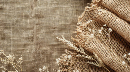 Experience rustic charm with a burlap background adorned with delicate lace, evoking the cozy warmth of rustic home decor
