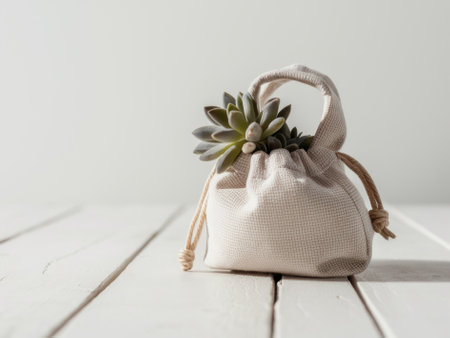 Canvas Pouch with Succulent Plant on White Wooden Table, Modern Minimalist Home Decor