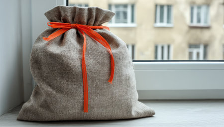 Light beige burlap sack with an orange ribbon tied in a knot sits on a light-colored windowsill in front of an out-of-focus window and urban background.