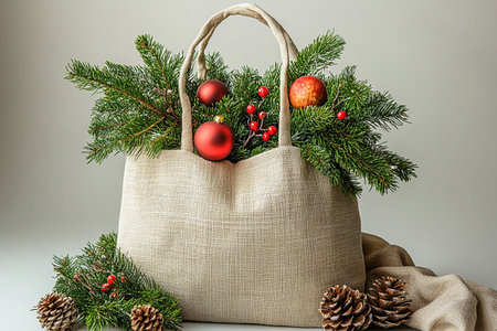 Reusable shopping bag made of fabric with Christmas tree branches on a white background. Christmas mood. Ideal for promoting sustainable shopping alternatives.