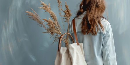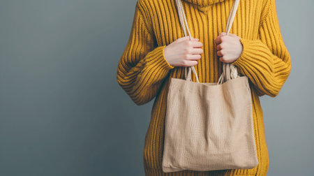 Girl is holding bag canvas fabric isolated on gray background. --ar 16:9 --v 6 Job ID: 80be7473-7f6d-490b-a110-3eb4553b16ca