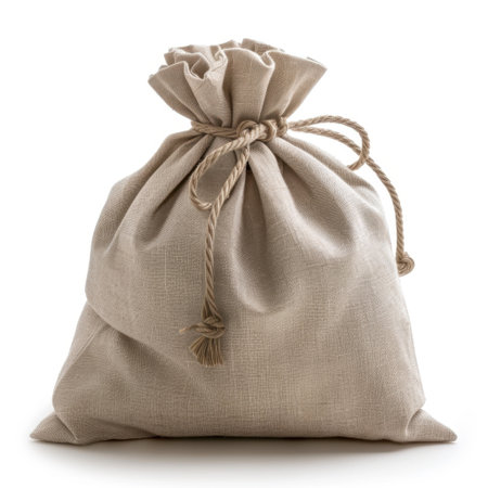 Linen drawstring gift bag, neatly tied with a string, isolated on a white background, symbolizing sustainable gift-wrapping.