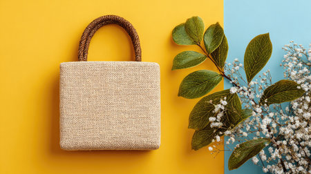 A chic handbag made from natural fibers sits on a vibrant yellow and blue background, surrounded by lush green leaves and delicate white flowers, creating a fresh and stylish look.