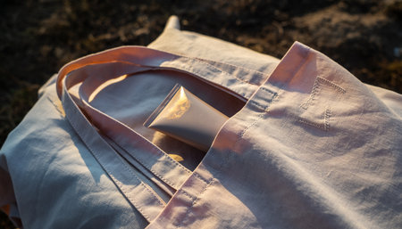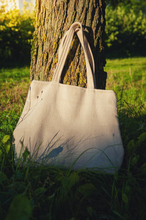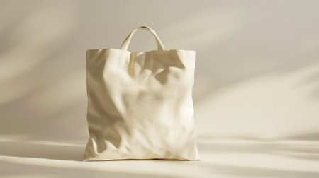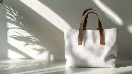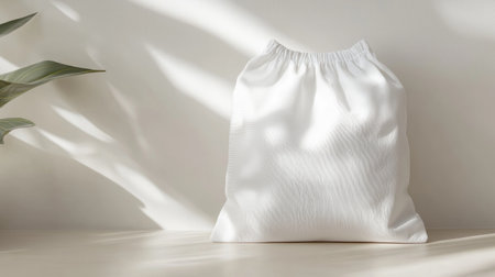 A minimalist white fabric bag sits elegantly on a light wooden surface, casting soft shadows, surrounded by gentle greenery. Ideal for eco-friendly themes.