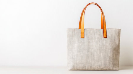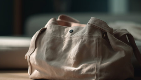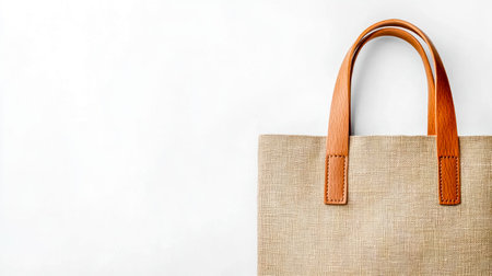 Beige shopping bag featuring brown leather handles resting on a white surface, highlighting the importance of reusable and eco friendly choices in modern consumerism