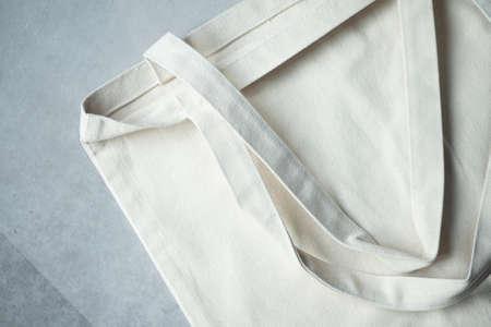 Cotton eco bag on a gray background, copy space, top view.