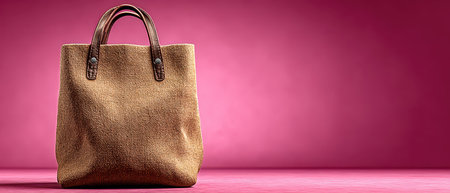A trendy tote bag made of natural material rests elegantly on a smooth surface with a bright pink backdrop showing its design and texture.