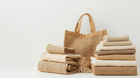 Beige and brown linen bag and stack of clothes on white background