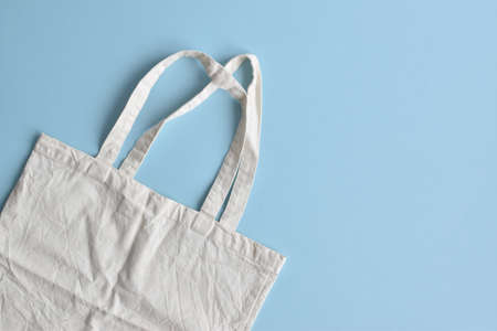 Zero waste concept. Eco friendly reusable textile shopping bag on blue background. Top view with copy space