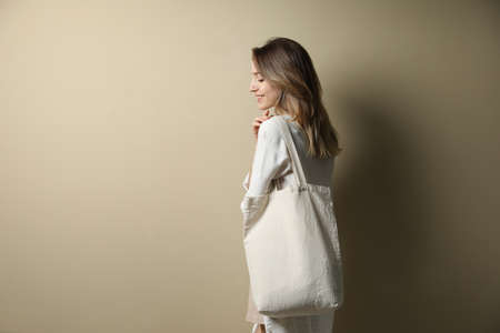 Happy young woman with blank eco friendly bag against beige background. Space for text