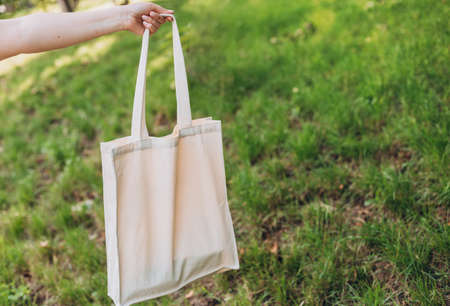 Reusable shopping bag, rejection of plastic. Female hand holding cotton eco bag. Caring for the environment, zero waste, sustainable lifestyle.