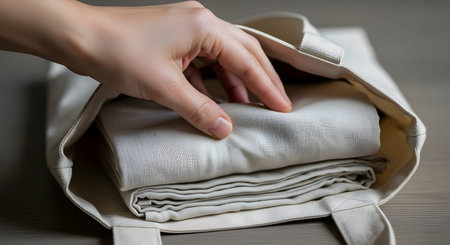 A person's hand organizing a folded beige fabric item into a canvas tote bag. The close-up shot highlights the texture of the materials and the concept of packing or organizing eco-friendly carriers.