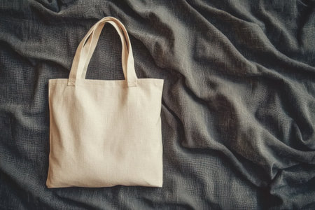 This mockup presents a simple white tote bag on a dark fabric background, ideal for showcasing designs or branding. Perfect for eco-friendly and stylish uses.