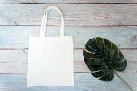 Tote bag canvas fabric cloth shopping sack mockup blank template on wooden background. Stock photo.