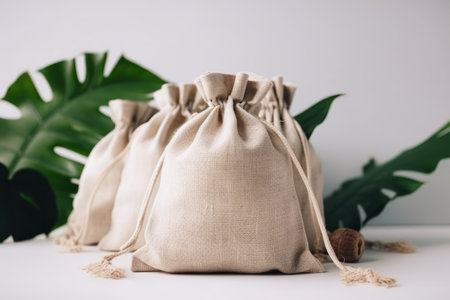 Bag of burlap with tropical leaves on a light background.