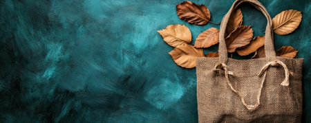 Capture autumn's sustainable spirit with our zero-waste flat lay A natural straw bag overflowing with dried leaves sits on a vibrant green background, showcasing eco-conscious living This stylish composition embodies responsible consumption, natural materials, and creative inspiration for a beautiful, zero-waste fall season AI Generative