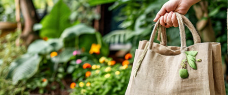 Hand holding eco-friendly jute bag in a garden