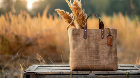 A charming rustic tote bag filled with straw wheat is placed on a wooden crate in a golden field at sunset, capturing the essence of autumn beauty.