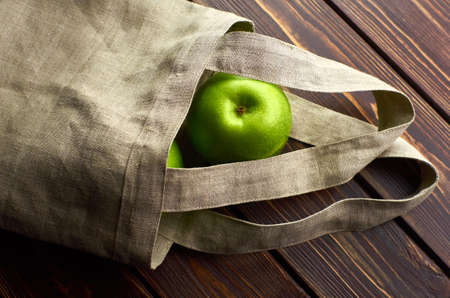 Reusable linen textile shopping bag with green apples. Zero waste shopping, recycling concept, eco-friendly lifestyle.