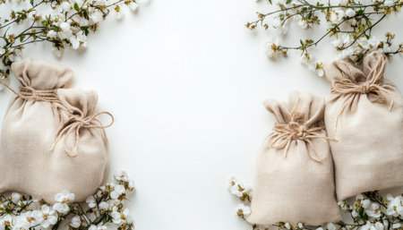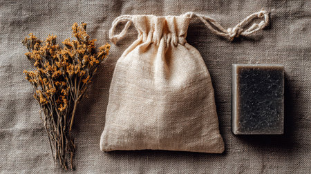 A cloth drawstring bag rests on a soft linen background, complemented by an eco soap bar and delicate dried flowers. This arrangement evokes tranquility and a connection to nature.