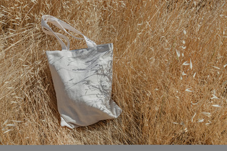 Canvas tote in dry grass, reusable bag mock-up, natural sunlight, place for design
