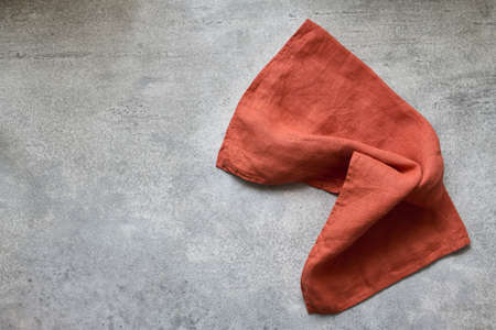 Folded linen napkin terracotta color on gray concrete table with copy space, top view