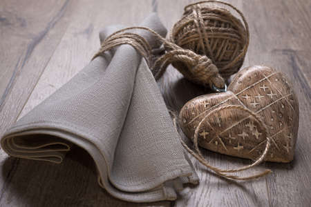 Happy Valentine! Linen napkin tied by cord with crude wooden heart