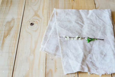 linen kitchen towel, napkin on a white wooden table with copy space, top view