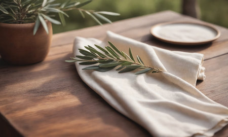 A sprig of greenery sits atop a folded napkin on a wooden table