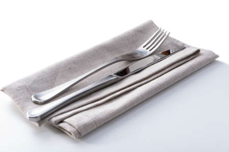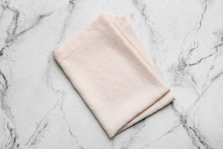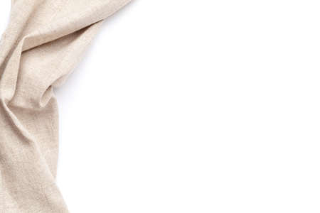 Flat lay with white linen kitchen napkin isolated on white background. Top view with folded cloth for mockup