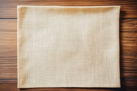 A soft neutral linen fabric neatly folded on a rustic wooden surface, perfect for showcasing warmth and simplicity in textile design and home decor.