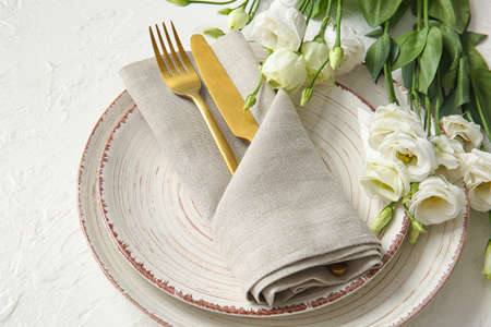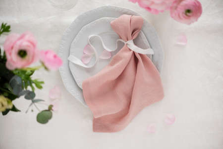 Elegant pink linen napkin on the white dish, wedding concept, selective focus image
