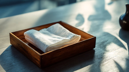 A white napkin is folded and placed on a wooden tray against a peach-colored background
