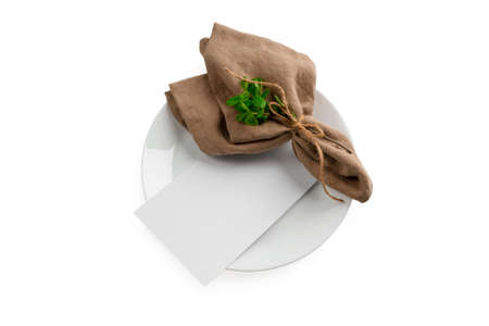 Plate mockup, ceramic plate on a kitchen towel, napkin isolated on white. Top view