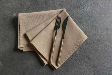 Folded linen napkin or towel with copy space for design. Gray linen towel on gray stone background. Recipe, food, meal, cooking concept. Copy space for text. Top view or flat lay