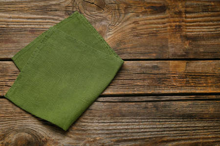 top view with green kitchen napkin isolated on table background. Folded cloth for mockup with copy space, Flat lay. minimal style.