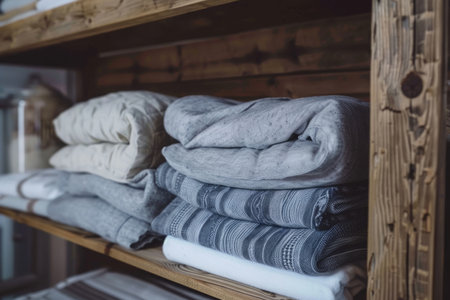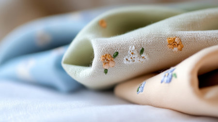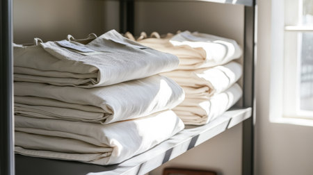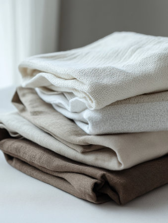 close-up of neatly folded laundry, with delicate fabric and fine stitches visible, created with generative ai