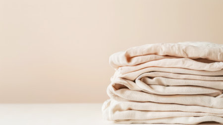 Fresh stack of light pastel beige cotton and linen fabrics, airy freshness concept. Eco detergent ad. Generative AI.