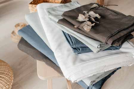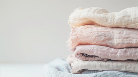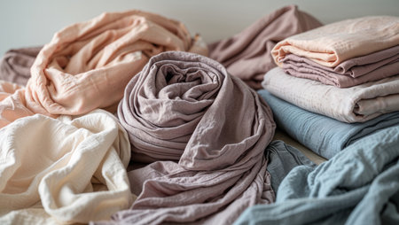 Fresh stack of light pastel colorful cotton and linen fabrics, freshness concept. Eco-laundry template. Generative AI.