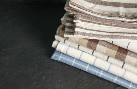 Tableware, material or cloth concept - Kitchen textile on black rustic wooden background, napkin and towel set, folded fabrics as food styling props for luxury home decor brand, interior design