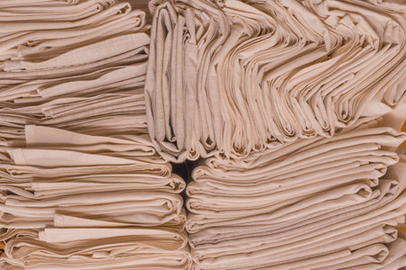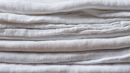 A close-up of neatly stacked soft white fabric layers, showcasing the texture and purity of the material, perfect for backgrounds or textile projects.