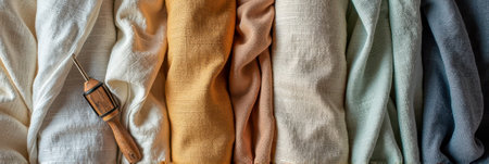 Assorted fabric textures in earth tones with wooden sewing tool. That the image is generated using AI.