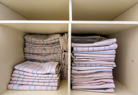 Interior of white plastic cabinet or clothing wardrobe with stacked pile of clean linen. Householding and order, furniture design concept.