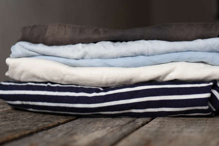 Clothing pieces in various colors are stacked neatly. The fabrics show folds and textures, enhancing the visual appeal in a simple arrangement.