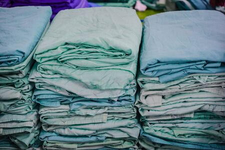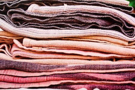 Stack of natural fabrics and textiles lie at a market stand. Sewing industry concept