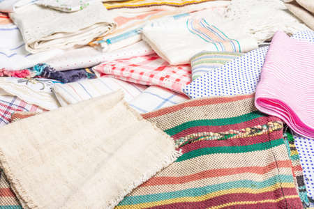 Collection of vintage textiles. Assorted different handkerchiefs from various types of fabric. Art and craft conception, place for text