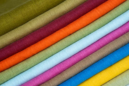 A stack of multi-colored bright linen fabric, close-up. Linen background. Fabric stripes