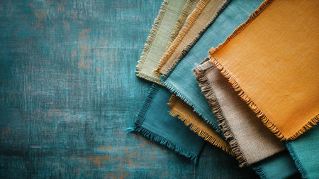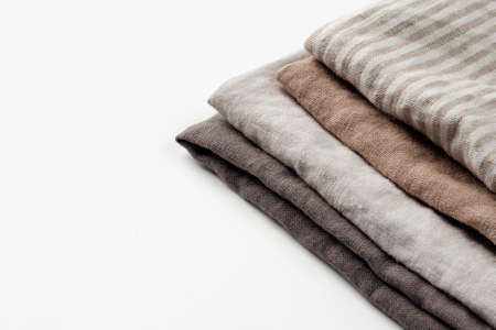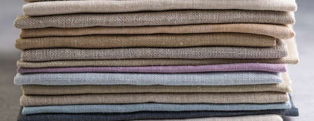 A pile of four folded dull-colored eco-friendly natural linen fabric on a rustic background, banner