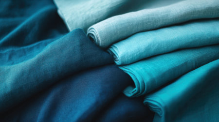 A neatly folded stack of cozy blue and green blankets sits in the soft morning sunlight, evoking a sense of calm, cleanliness, and fresh comfort. This minimalist scene is perfect for concepts of home, organization, and serene living.