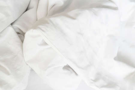 Top view of the crease of an unmade bed sheet in the bedroom after a long night sleep and waking up in the morning.
